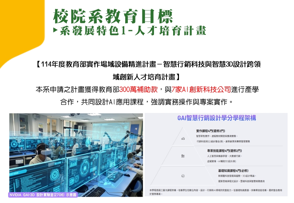 本系招收對「人工智慧」、「繪圖插畫與虚擬角色設計」、「視覺設計與3D動畫」、「數位教材與數位遊戲」、「元宇宙、虛擬實境(VR)與擴增實境(AR)」、「網站設計」、「新媒體」以及「行銷科技、數位行銷與電子商務」有興趣的同學,搭配多國語言學習,培養專業知能與語言兼備的國際化數位內容設計人才。