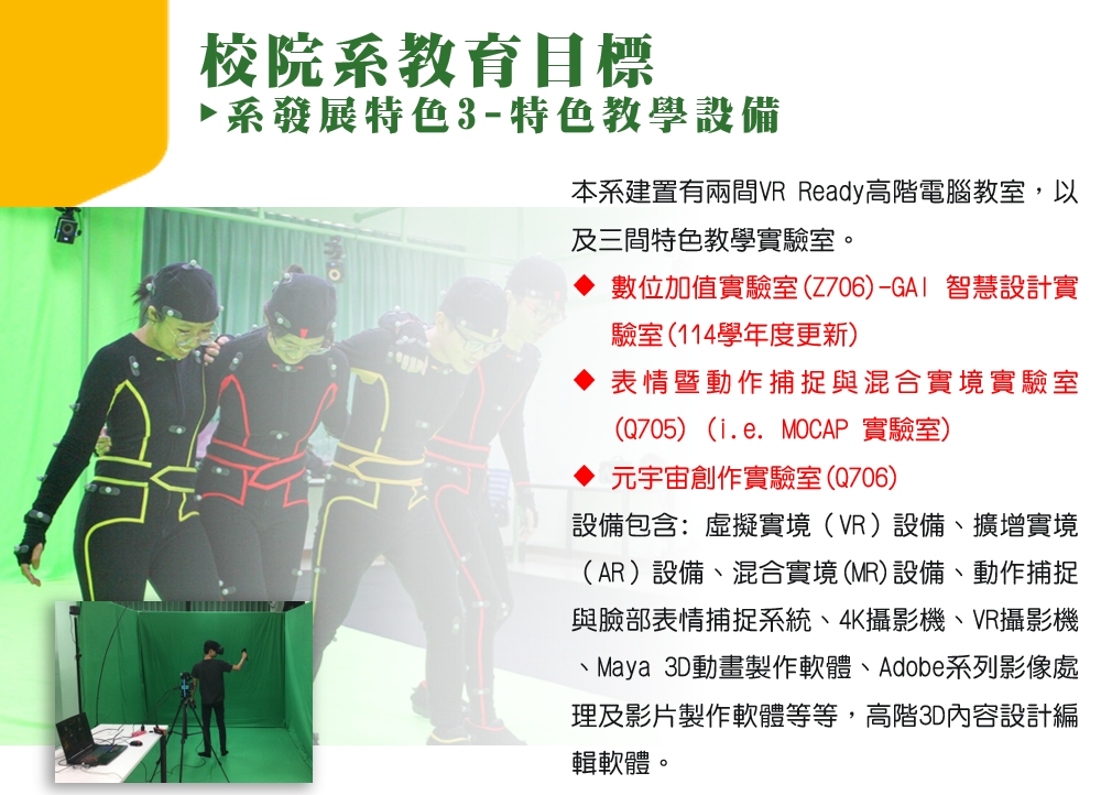本系藉由運用歷年來之教育部獎補助款與特色計畫經費,建構兩間貴重特色教學實驗室: 「表情暨動作捕捉與混合實境實驗室(教室編號:Q705)」與「元宇宙創作實驗室室(教室編號:Q706)」