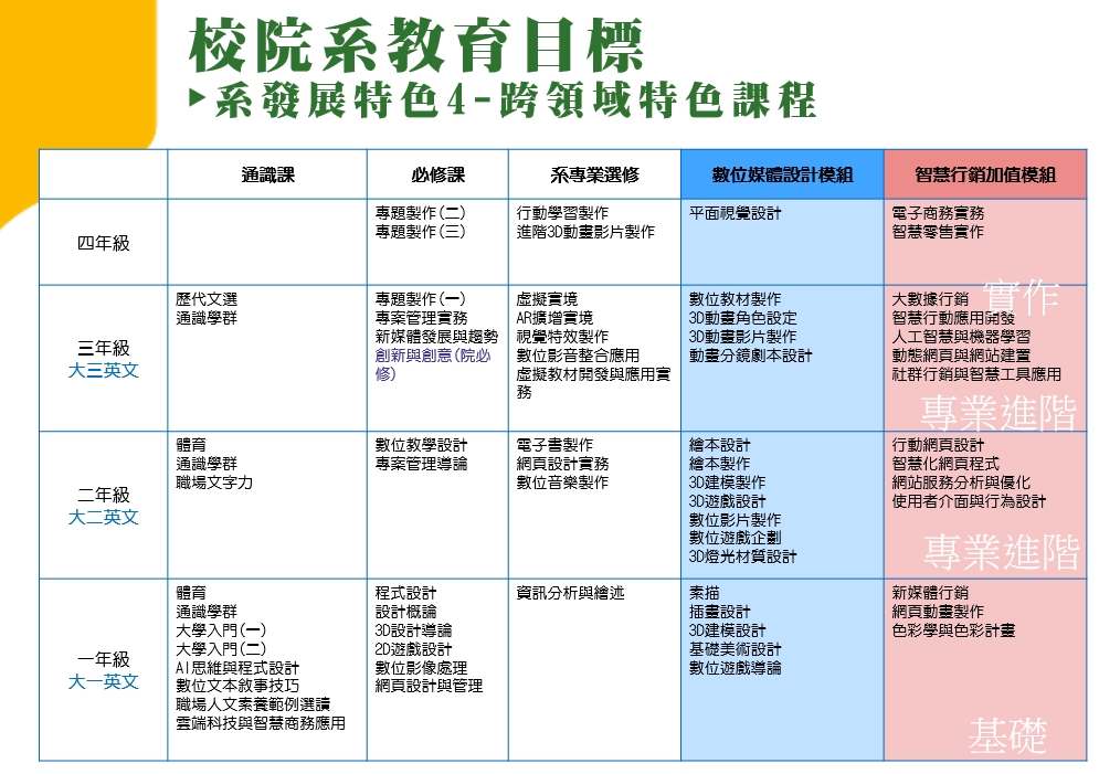 因應產業的需要,設計多元跨領域專業選修課程模組,並透過三個學期的專題製作課程加以整合。